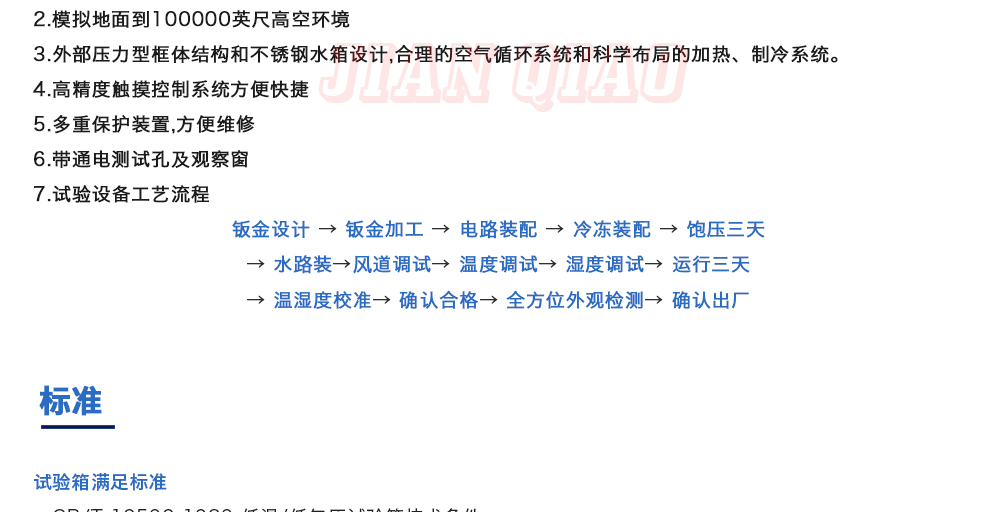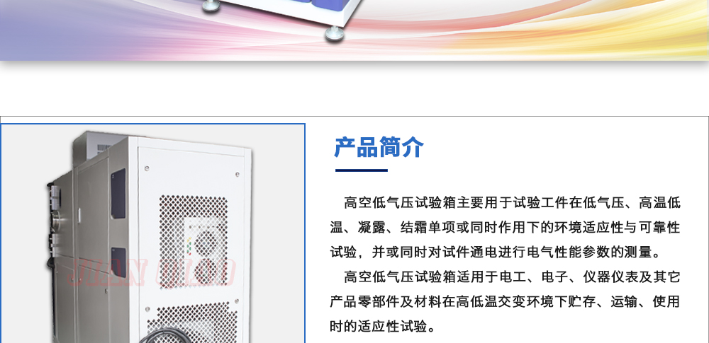 用途:高空低氣壓試驗箱主要用于試驗工件在低氣壓、高溫低溫、凝露、結(jié)霜單項或同時作用下的環(huán)境適應性與可靠性試驗,并或同時對試件通電進行電氣性能參數(shù)的測量。高空低氣壓試驗箱