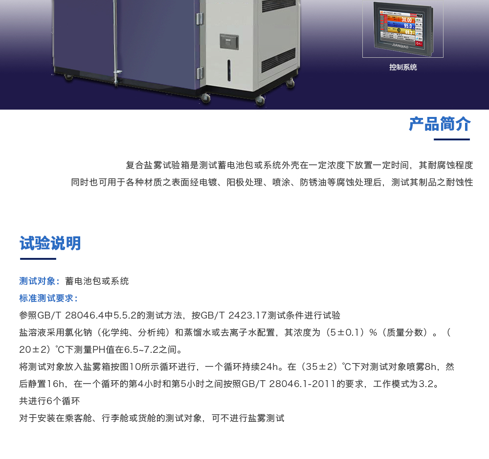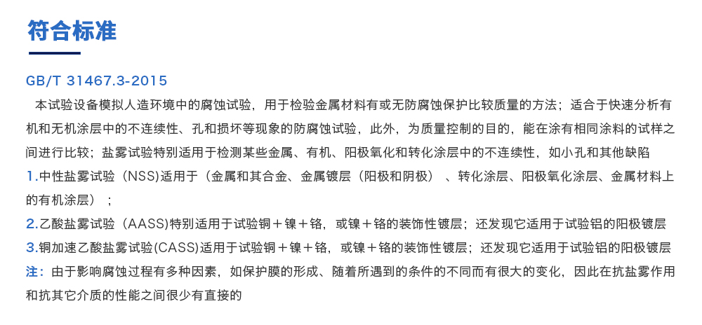 用途:復(fù)合鹽霧試驗箱是測試蓄電池包或系統(tǒng)外殼在一定濃度下放置一定時間,其耐腐蝕程度同時也可用于各種材質(zhì)之表面經(jīng)電鍍、陽極處理、噴涂、防銹油等腐蝕處理后,測試其制品之耐蝕