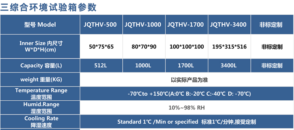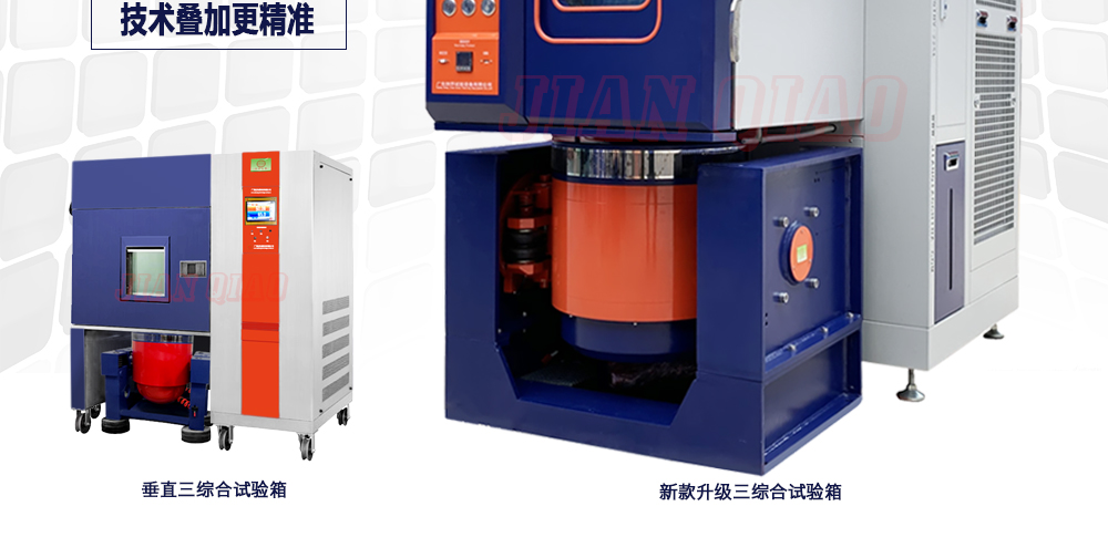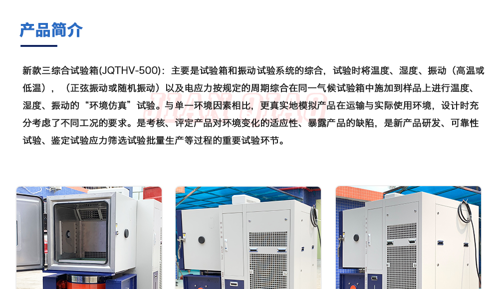 用途:新款三綜合試驗箱(JQTHV-500):主要是試驗箱和振動試驗系統的綜合,試驗時將溫度、濕度、振動(高溫或低溫),(正弦振動或隨機振動)以及電應力按規定的周期綜合在同一氣候試驗箱中。