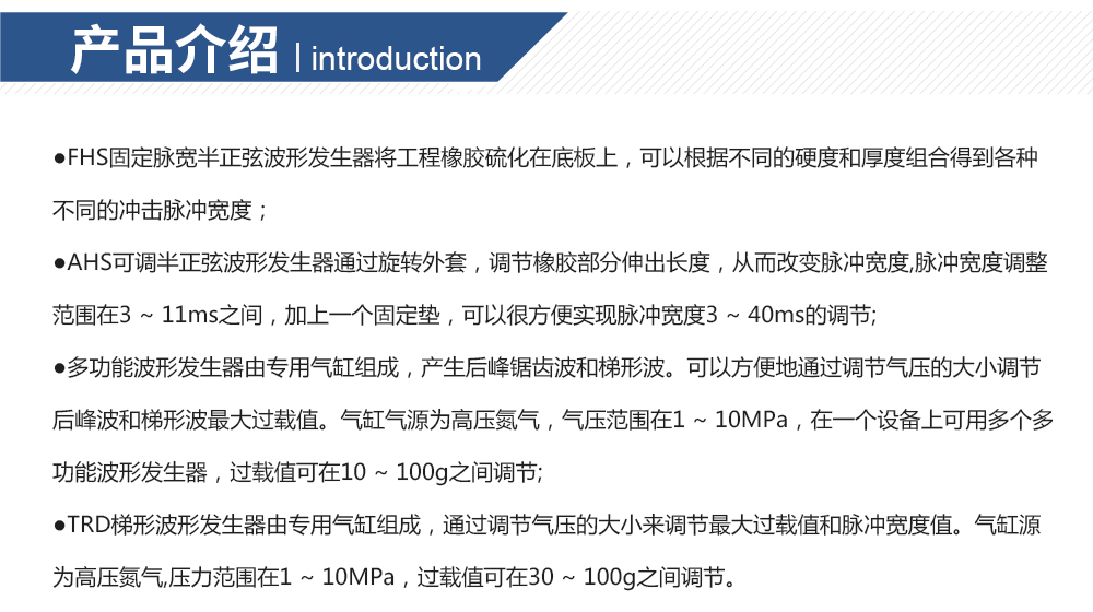 用途:FHS固定脈寬半正弦波形發生器將工程橡膠硫化在底板上,可以根據不同的硬度和厚度組合得到各種不同的沖擊脈沖寬度。
