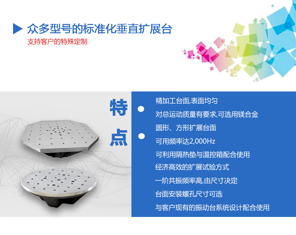 用途:供應(yīng)眾多型號(hào)的標(biāo)準(zhǔn)化垂直水平擴(kuò)展臺(tái),而且支持客戶的特殊定制,從而滿足客戶對(duì)振動(dòng)臺(tái)性能擴(kuò)展的需求。在實(shí)際振動(dòng)試驗(yàn)時(shí),試件或夾具往往會(huì)大于電動(dòng)臺(tái)動(dòng)圈臺(tái)面,這時(shí)就需要對(duì)